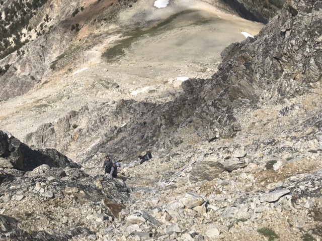 Clint reached the summit first. Alex and Terry were just above me as we zig-zagged up a steep gully about a hundred feet from the top. I lightly stepped on what appeared to be a solid section of rock. Instantly, all hell broke loose. I dislodged a bushel basket-sized rock. It took off, going from zero to sixty nearly instantly. It was one of those moments when time seems to stand still. “Rock,” I screamed. In my mind, I could see the tragic headlines, “Guidebook Author Kills Outdoor Idaho Crew.” The rock careened down the gully hitting one side and then the other.