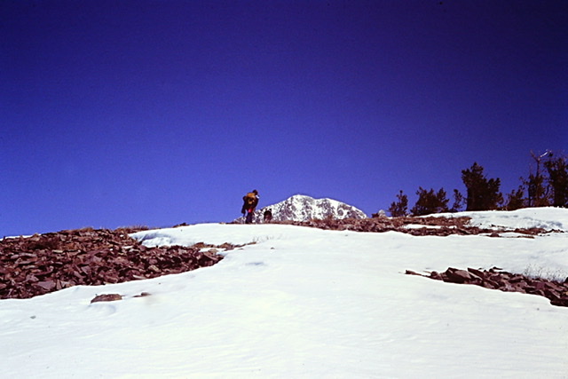 I dropped off the knob and waded through the last punky snowfield leading to the base of the snow-free west face. I climbed up rocky steps taking care to avoid dislodging the abundant loose rock that covered the ledges. I was tired. I kept expecting to reach the top at any minute. At 3:45PM, I checked the barometric altimeter I carried. It read 11,200 feet. I could not believe that I had only gained 400 feet in 40 minutes. I knew that I could not do another 400 feet in the fifteen minutes left before I had agreed to turn around. Dejected, I started down. Disappointed but energized by our near miss, we vowed to return more than once as we made the long, tiresome descent.
