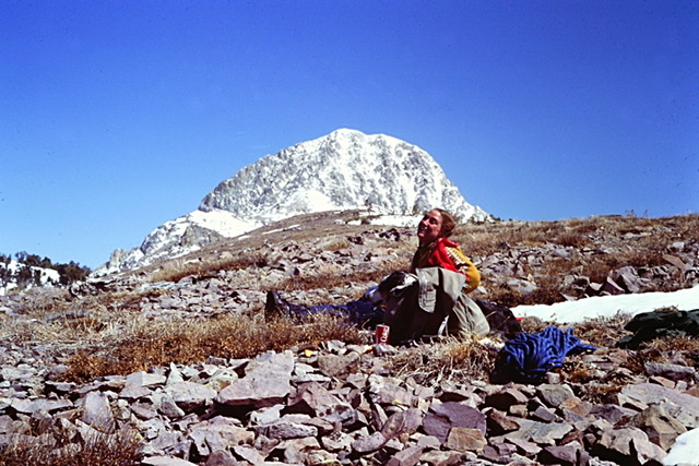 The snow had receded significantly and, from the valley, a mostly snow-free ascent looked possible. The next morning, we drove to Basinger Creek at the base of the peak’s west ridge. We parked and started our ascent with a steep climb up a sagebrush slope to the broad ridge crest. We were young and felt invincible. I remember singing a parody of Steven Foster’s Camptown Races substituting “Bell Mountain climb” for “Camptown races.” Nowadays, I no longer waste energy or breath with unnecessary talking or singing when climbing steep slopes.