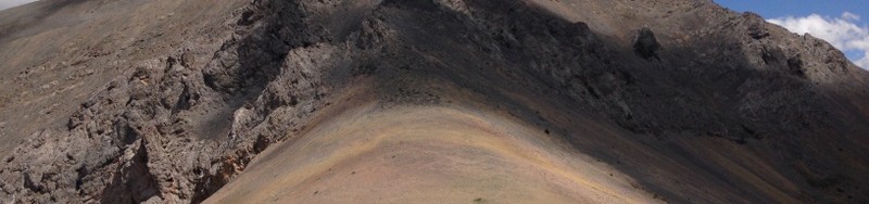 My GPS track for a traverse of the peak. We took the West Ridge up, dropped northwest off the summit, and descended the adjacent canyon.The lower portion of the West Ridge provides good footing and few obstacles.This view up the West Ridge from roughly 9,200 feet.The final saddle is at 9,800 feet.The final 300 feet crosses talus and a few rocky obstructions.The final walk. There is a large cairn on the summit with a glass jar filled with bits of wet paper.The view down the ridge crest to North Twin, South Twin, Red Cone, and Jaggle Benchmark.Descending the canyon that parallels the West Ridge on its North Side leads you past the large cave shown in this photo.Sunset Peak as viewed from Sunrise Peak to its southeast. Livingston Douglas Photo