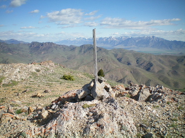 Follow the 2-track jeep road back to the 7,940-foot connecting saddle with Peak 8319 at the base of the south ridge. Leave the road here and scramble east along the magnificent [and obvious] east spur to return to Rocky Canyon. The east spur is a combination of sagebrush and a few rocky areas as you descend it to a saddle at 7,620 feet. Continue east up over a ridge hump (85 feet of uphill). The ridge bends left/northeast then bends right/east to reach a minor saddle just under, and west of, Point 7158. This ridge section is rocky, choppy, and includes the dreaded mountain mahogany. The terrain between the small saddle and Rocky Canyon gets VERY ROUGH. The easiest way down into the canyon is via a gully that heads southeast from this saddle and then bends left/east to reach Rocky Canyon.