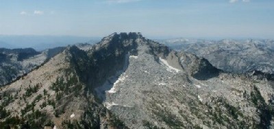 They told us to expect years of blowdown on the trail. We elected to follow the Nelson Lake Trail and then follow the ridge, and below the ridge (southwest of it), out to 9,439 feet. This route was long and slow talus sidehilling and is not recommended. It was Class 3. On Bare Peak, Andy Martin and I agreed that the 9,439-foot elevation must be for the border monument. It is clearly not the highest point, as two 9,440-foot contours are shown (one partly obscured by the state/county line) on the USGS topo map. Before visiting the spot, we had some discussions about how there could be a 9,440-foot contour at a 9,439-foot spot elevation.