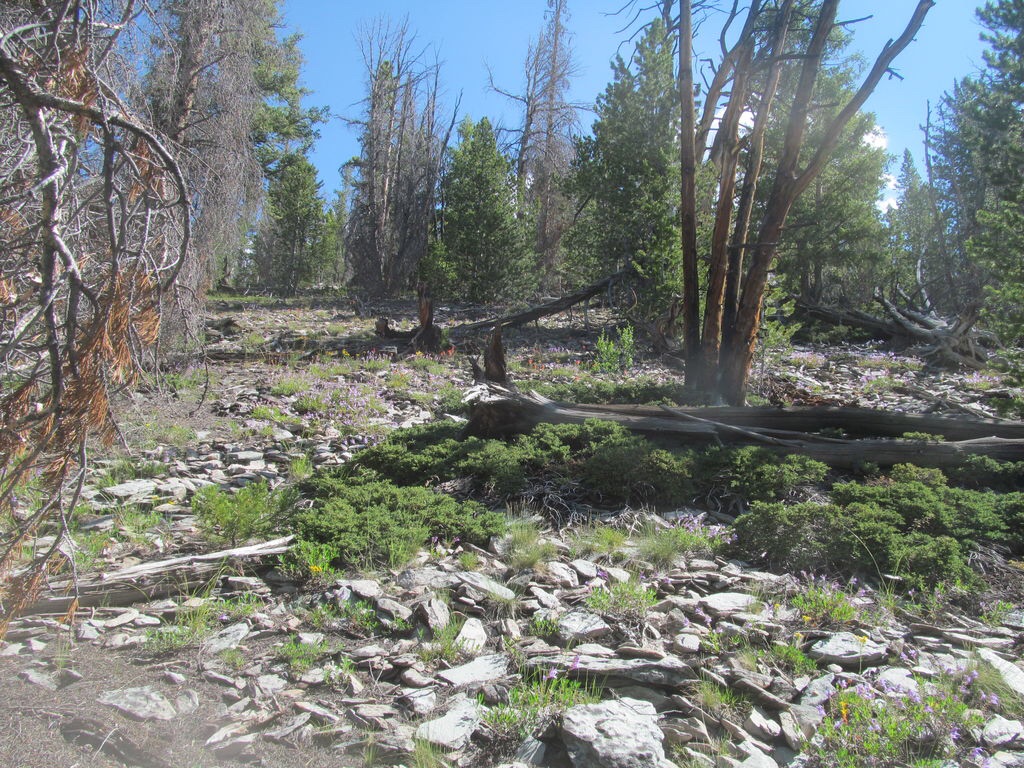 Big Creek Peak can be climbed from the southwest via the Big Creek Campground. Most of the route is off trail but mostly easy travel, nothing harder than Class 2. A compass or GPS will be useful. Leave the trail at the campground and follow it a little over a mile, looking for a small side trail that comes in from the right. Take a sharp right on this small climber’s trail, which due to its angle may be easy to miss on your way up the main trail. The junction is near 44 27.242 N, 113 35.605 W.