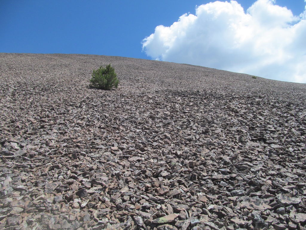 I descended this route as part of a traverse from Big Creek Peak to Flatiron Mountain. So my description begins on the summit of Big Creek Peak. From the summit, follow the ridge southeast on broken rock (goat trails help here) to reach the narrow, rocky 10,500′ saddle connecting Big Creek Peak to Flatiron Mountain. This ridge descent is a straightforward endeavor and takes only 20 minutes.