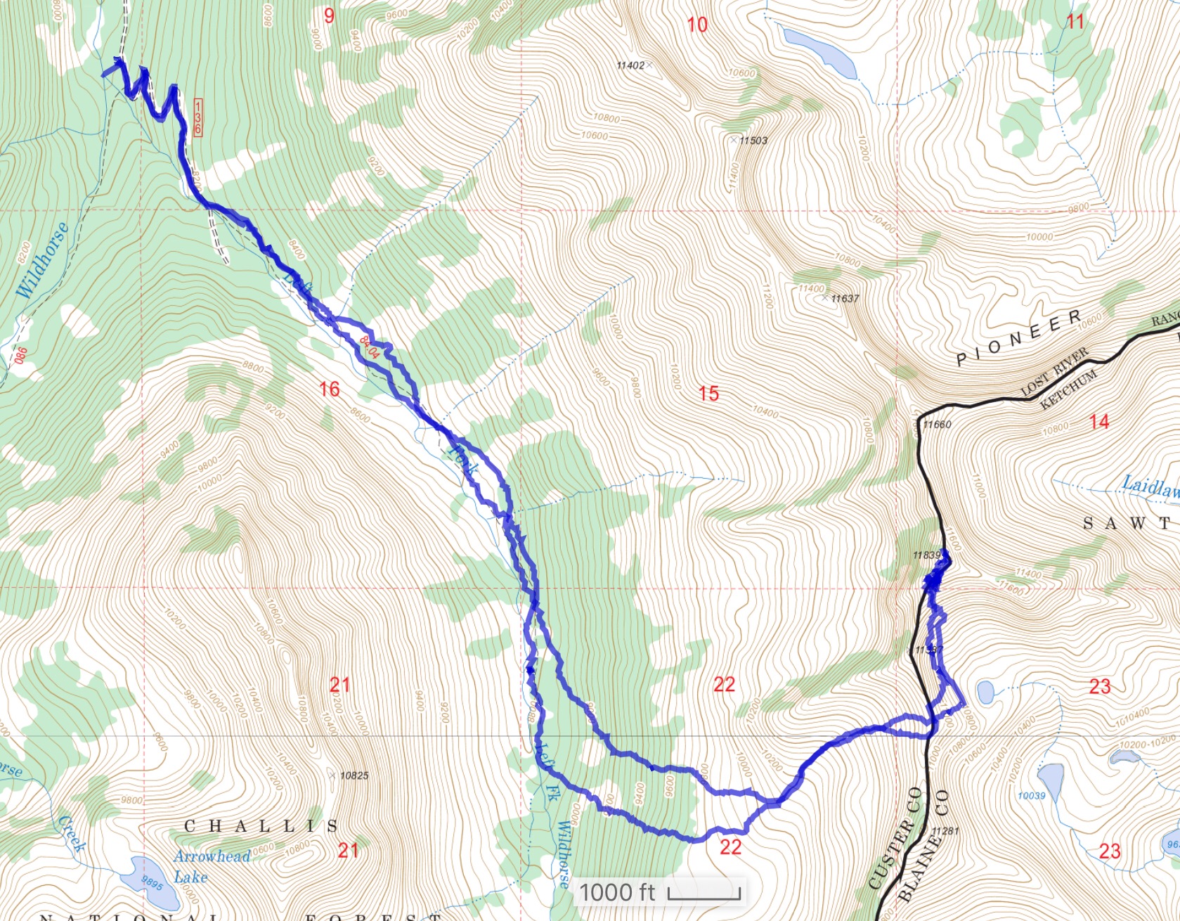 From the end of Wildhorse Road (below Mustang Peak), approaching from the East Fork of Wildhorse Creek.