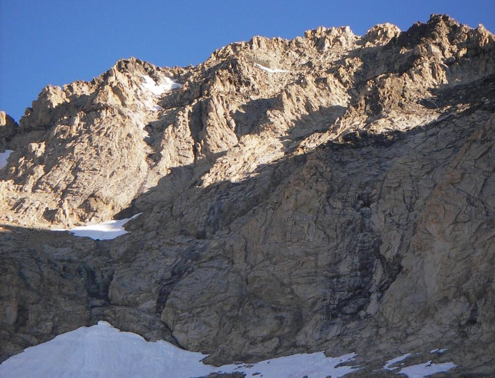 Climbing and access information for this peak is on Pages 252-253 of the book. The information in the book is a bit confusing. First, the two routes listed basically cover the same route (i.e., the South Ridge) but from two different starting points. The book references Rick Baugher’s South Face route but provides no further detail. Thus, below you will find revised route descriptions for the routes in the book, descriptions for the South Face and the Northwest Gully routes, and a link to the West Face Direct route first climbed by Pat McGrane, George Reinier, and Johnny Roache in 2009.