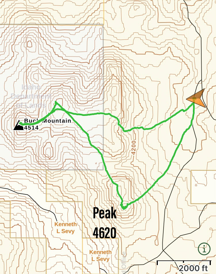 There are six Buck Mountains in Idaho and a total of 23 peaks that include the word “Buck” in their names. This Buck Mountain is situated on the west end of the Owyhee Mountains, just east of US-95. While not a towering summit, it is a worthy goal in the Spring with excellent access. The summit can be reached in just over 1.0 miles with 800 feet of elevation gain. USGS Jump Creek Canyon