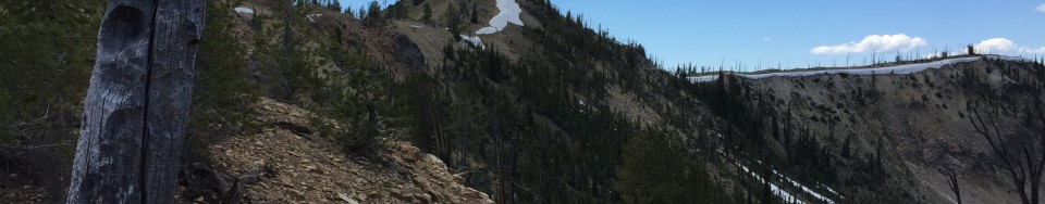 You can access both the East and Southeast Ridges from the well-graded Bull Trout Lake Road. Both ridges are guarded by a large, shallow lake which is gradually turning to meadow. So pick your route to avoid the wet ground. This photo shows the peak from the East Side of the lake. We traversed around the lake on its North Side. If you start from the vicinity of Bull Trout Lake, you will pass this lake on its West Side.Wildflowers on the East Ridge (6/19/15).Looking down the East Ridge from roughly 7,800 feet. Bull Trout Lake is on the right. The lake turning into a meadow is in the center.At about 8,000 feet, the East Ridge narrows. This photo shows an unnamed lake nestled into the ridge’s North Side.As the ridge narrows, you discover it’s still a long way to the summit. Fortunately, there is only minimal up and down along the way and the obstacles you encounter are easily bypassed on the ridge’s South Slopes.This is the second unnamed lake nested along the North Side of the East Ridge.The top of the East Ridge is quintessential Central and Eastern Salmon River Mountain terrain which offers views and good walking.The summit comes into view after you cross a point designated as Mains Ridge. It’s roughly 0.25 miles away at this point.The summit register left by Jon Fredland in 2010. Bull Trout Point was his 2,000th summit. Congratulations to Jon.