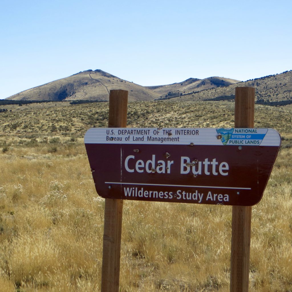 At 1.3 miles, reach a [signed] junction with Cedar Butte Road (right turn). Turn right/west onto Cedar Butte Road and drive 4.4 miles to a signed junction for “Cedar Butte” (large BLM sign). The first 4.0 miles of Cedar Butte Road is wide and smooth (40-45MPH) until it reaches a UPRR railroad crossing. The road narrows here and becomes considerably rockier for the final 0.4 miles.