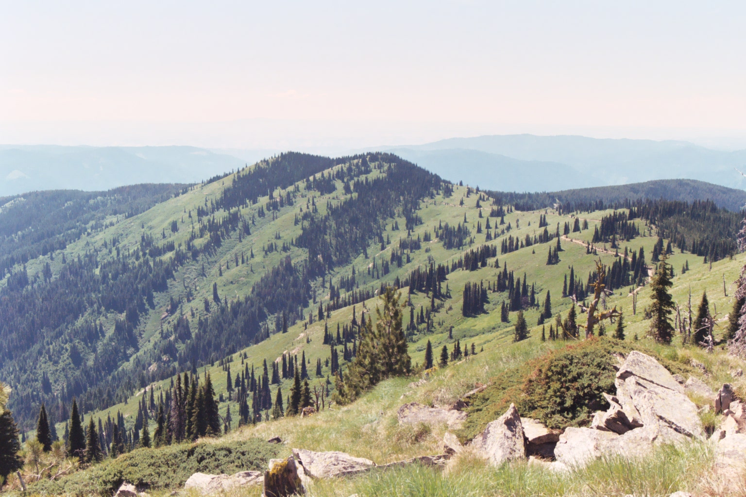 Spectacular view abound! To the west, you can see far beyond the Camas Prairie into the big canyon country of Oregon and Washington States. To the north, look into the northern Clearwater Basin and possibly a few points within the St. Joe. To the south, view the higher summits on the South Fork Clearwater/Salmon Divide. On a clear day, you can see peaks south of the Salmon, the Seven Devils, and possibly beyond the Devils. But the eastern view is the best, with the high-central Selway Crags in the foreground and the higher expanse of the Montana Bitterroots far beyond.