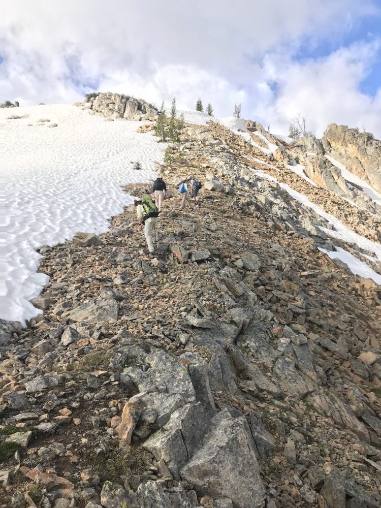 Park at Profile Gap. Walk south back down Big Creek Road to a junction with an old mining road that runs due south. Follow the road past a collapsed cabin. At the 7,800-foot contour, start ascending southwest toward the top of the West Ridge aiming to reach the ridge top at roughly 8,500 feet. Continue up the ridge to the summit. It is a little over a mile with 1,200 feet of elevation gain to the top. See the GPS track below.