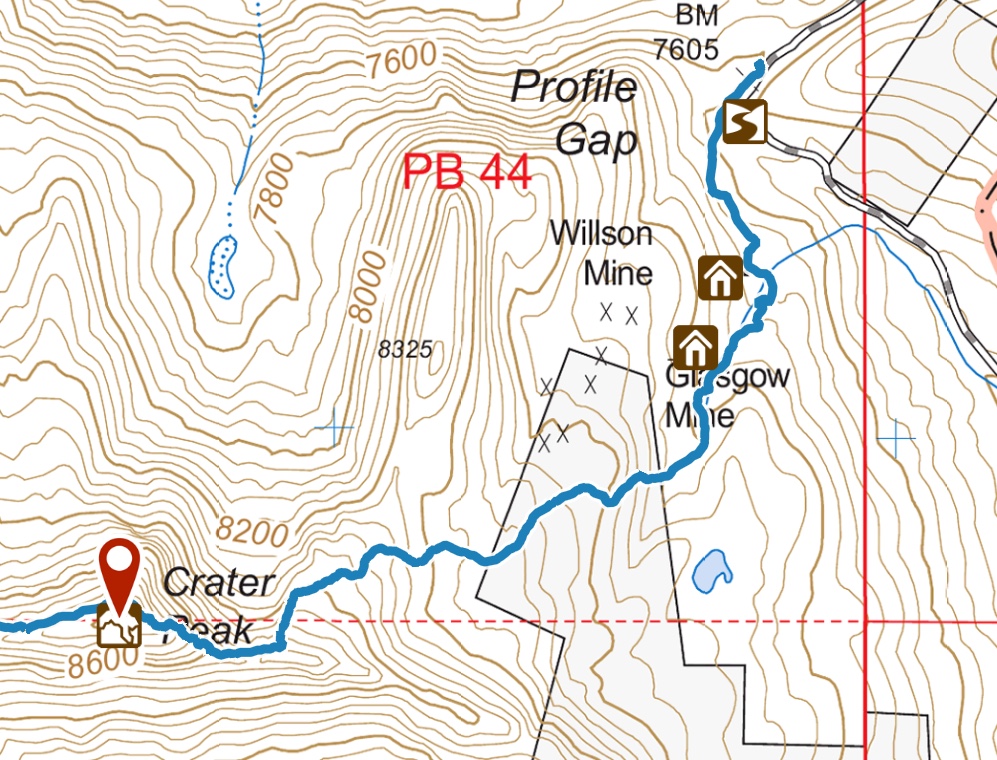 Crater Peak is located just east of Profile Gap. It is the first of 7 peaks between Profile Gap and Parks Peak to the west. The really ambitious can follow the connecting ridge to Parks Peak. The next peak along the way is Willson Peak. USGS Profile Gap