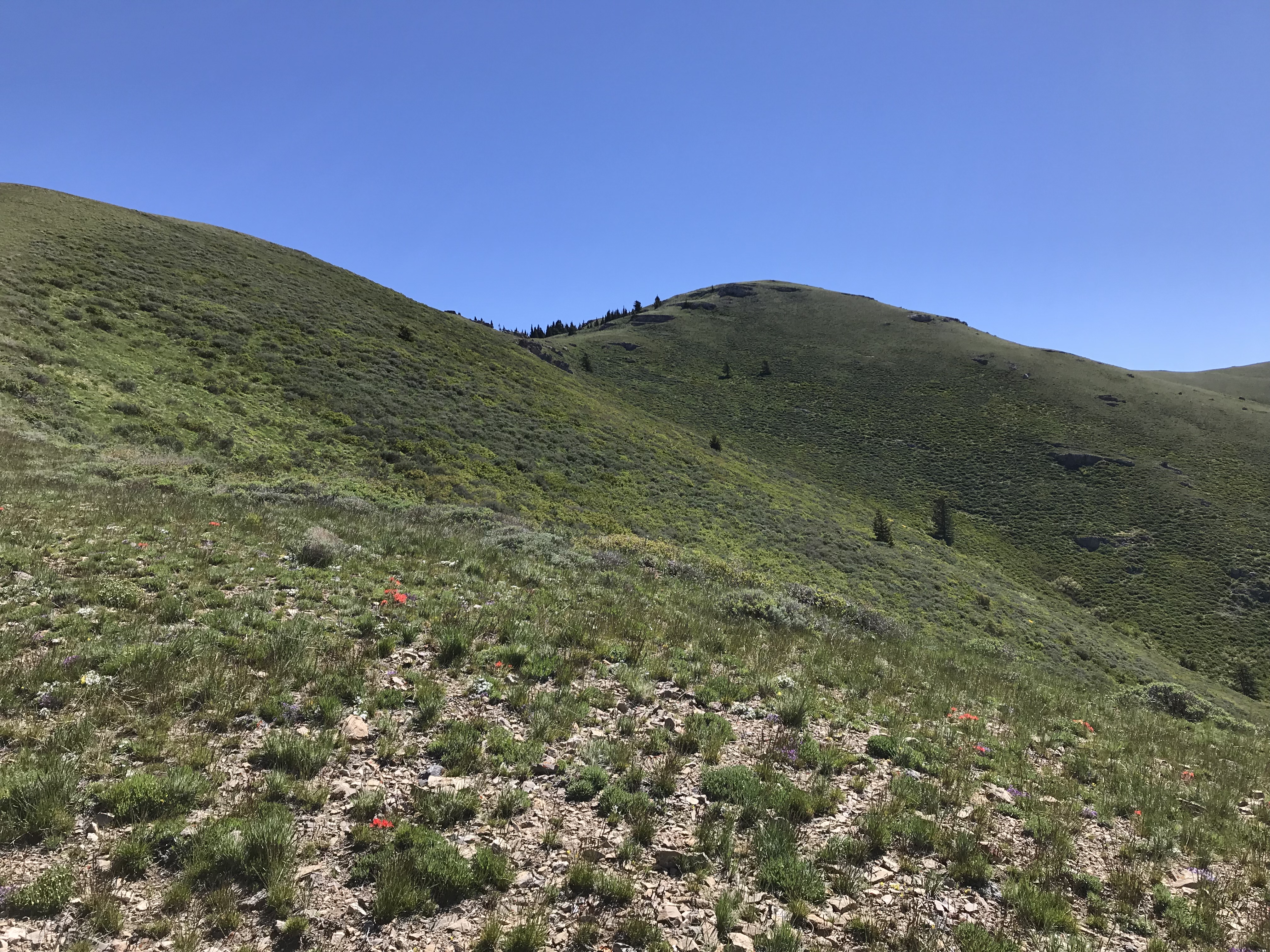 Ken adds: From the saddle, an unmarked jeep trail heads a couple of hundred yards to the 7,400+ summit to the ESE. We walked this, but a high-clearance vehicle could have driven it. From this point, hike ENE with some bends, following the main ridge all the way to Deep Creek Peak. There are a few rocky and or brushy bits in the first mile or so, but there are reasonable animal/human paths through the worst of them.