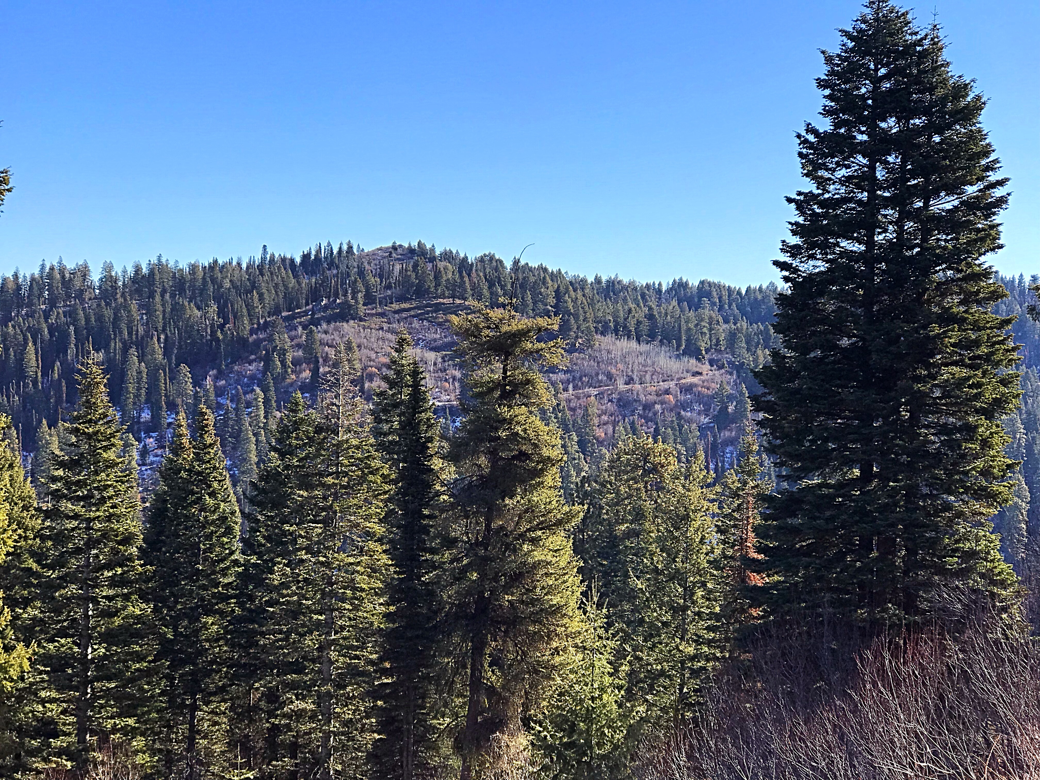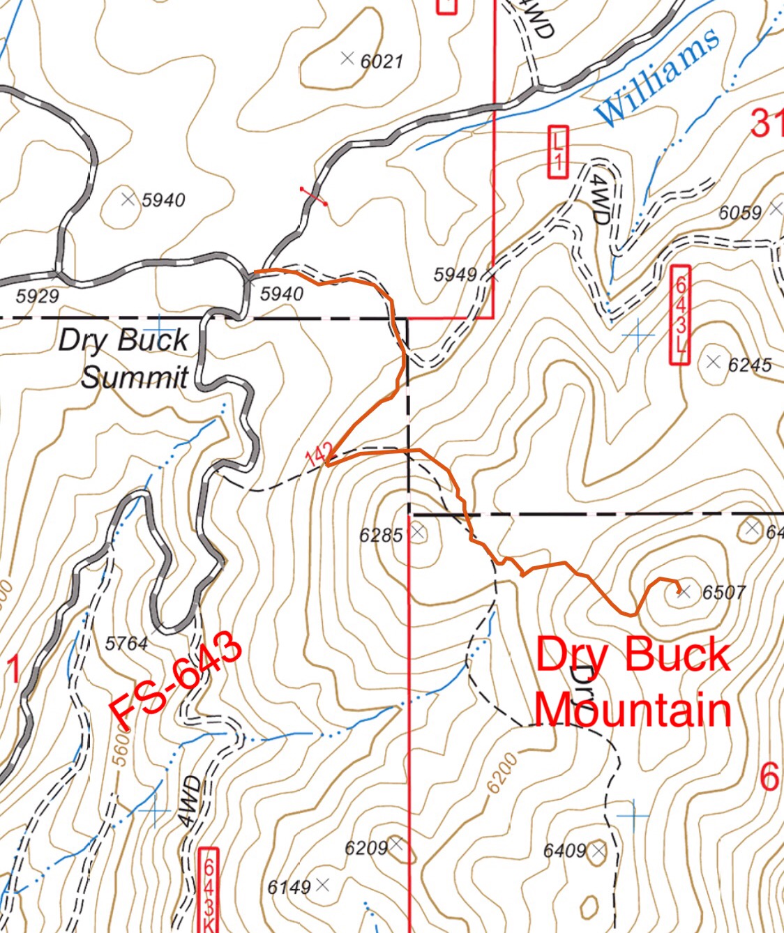 At Dry Buck Summit, FSR-643L (as shown on my GPS track from the National Forest Service topo) leads east to the base of Dry Buck Mountain and quickly forks. The right fork does not show on the topo map, but take it. This road climbs across the peak’s West Face. Eventually, you will find a junction on the Southwest Corner of the peak with an ATV trail that climbs northeast to the summit. If you are up for bushwhacking, immediately leave the road and climb up the West Slopes to the summit.