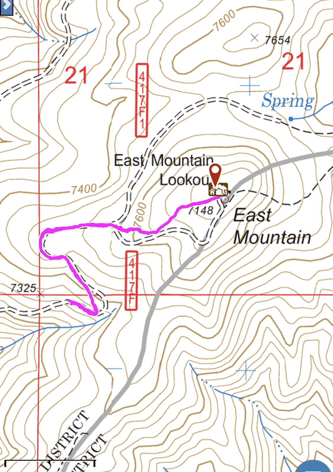 The road system is accurately shown on the Forest Service maps. The final section of the FS-417 road system is designated FS-417f. FS-417f is rough and rutted in places. It covers the final 1.5 miles to the summit with about 900 feet of elevation gain.