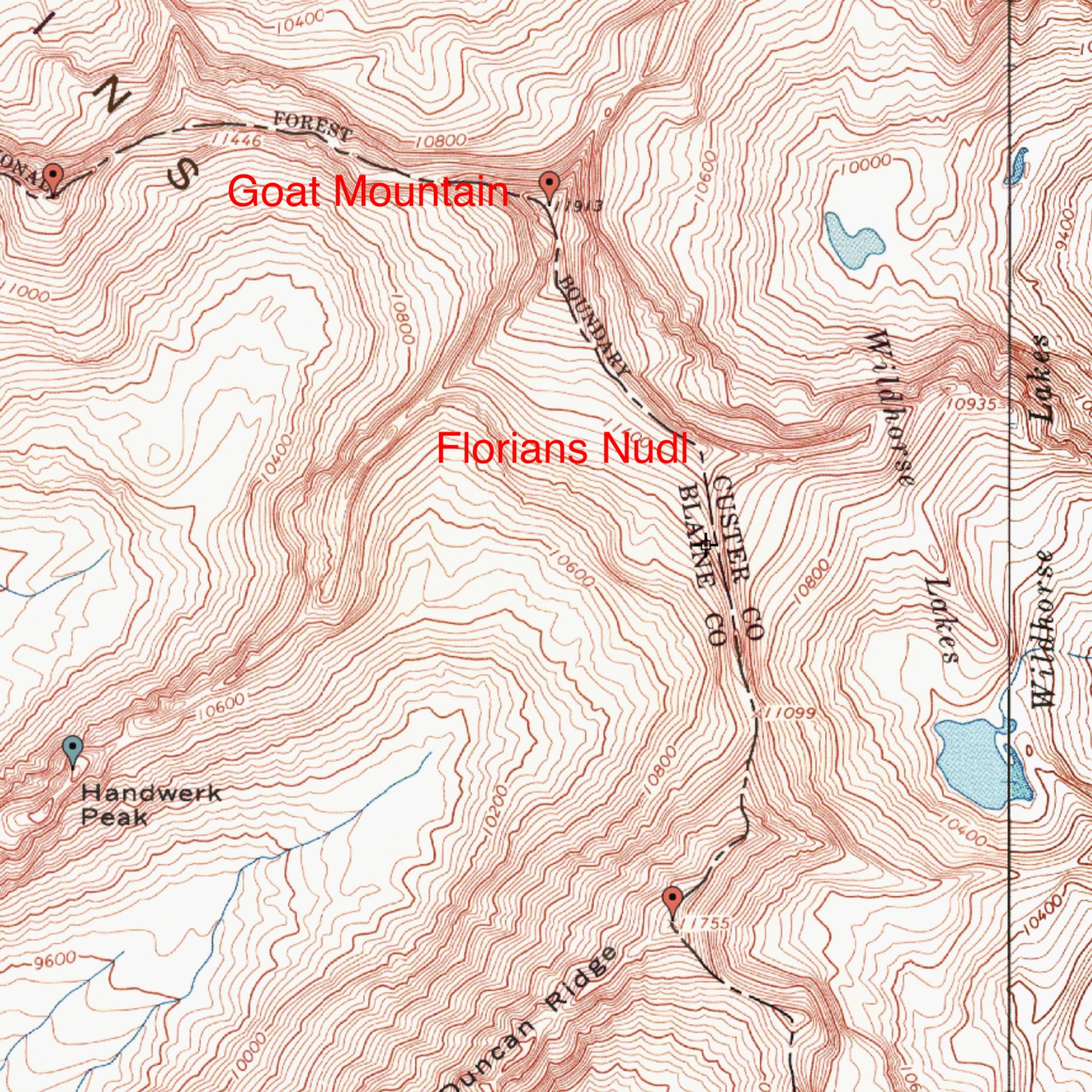 Florians Nudl is a formation on the South Ridge of Goat Mountain. Florians Nudl is named after Florian Haemmerle, one of the first European guides employed by the Sun Valley Company (see Page 18). Although Florian and other guides climbed it before World War II, route information was nonexistent or at least undiscoverable. Finally, we now have route information. Colorado climber Livingston Douglas has shared his beta on his 2009 climb. USGS Phi Kappa Mountain