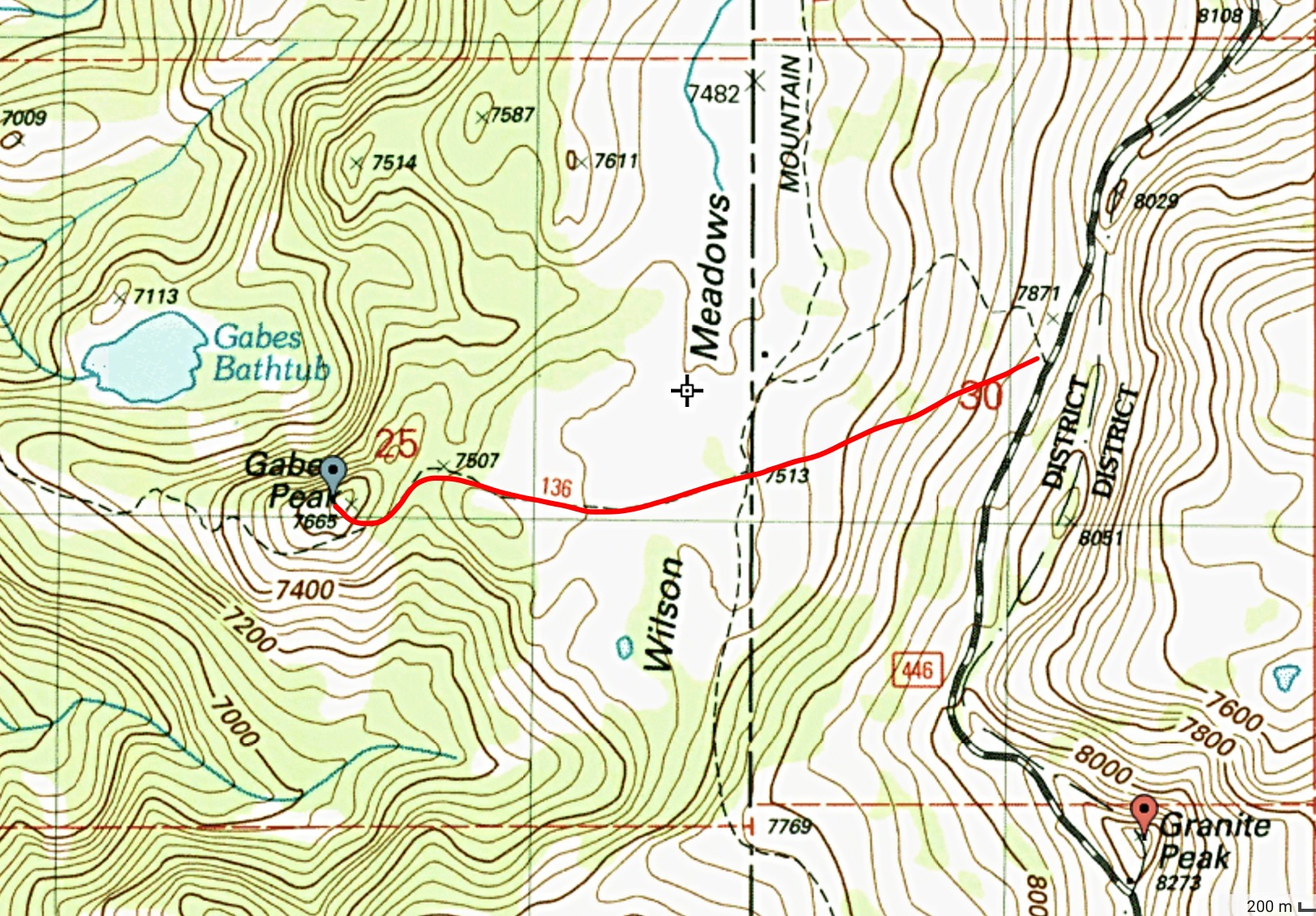 Gabes Peak is a minor, tooth-shaped summit found west of Granite Peak and the Snowbank Mountain Road. It is a great perch for surveying the Sierra Nevada-like meadows on the west side of the ridge crest. The country between Gabes Peak and Snowbank Mountain Road is mostly open and easy to traverse despite the fact that the trail system shown on the maps is either nonexistent or confused by multiple cattle trails. The trail that traverses the peak’s South Slopes can be found as you get closer to the summit. Climb the peak from the trail via its Southeast Slopes. Class 2. USGS Tripod Peak