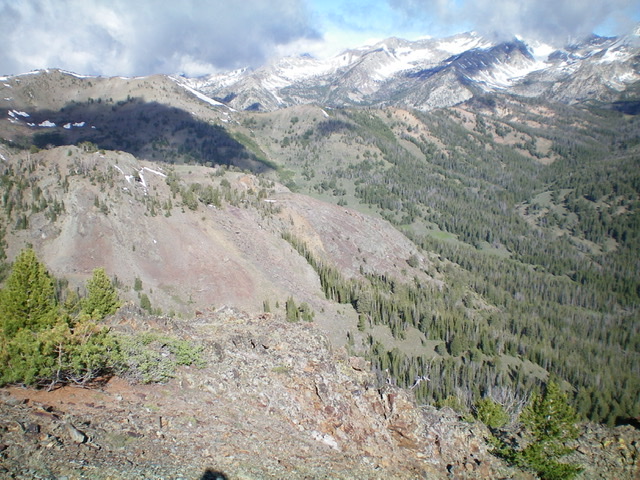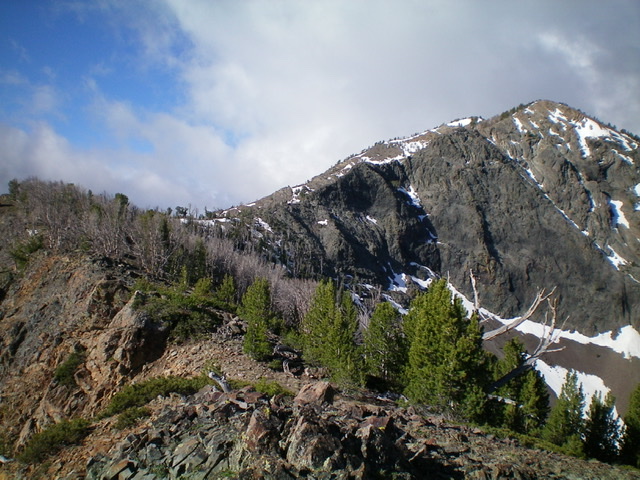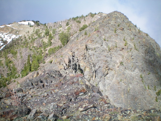 Having had to wrestle with many snow patches on the ascent of the northeast spur/north ridge, I decided to descend the [mostly snow-free] northeast ridge/northwest spur. Choose your poison because the upper northeast ridge is pretty rough. From the summit, follow the narrow, rocky, steep ridge line northeast for several hundred feet down to a flat, forested section of the ridge at 9,640 feet. This upper section is a narrow, choppy mess of rocky blocks/towers. It was a struggle to keep it at Class 3. Descend/downclimb some minor chutes/gullies on the right/south side of the ridge to pass a few of the towers. Loose scree on the ledges and in the chutes/gullies make this a rather challenging affair.