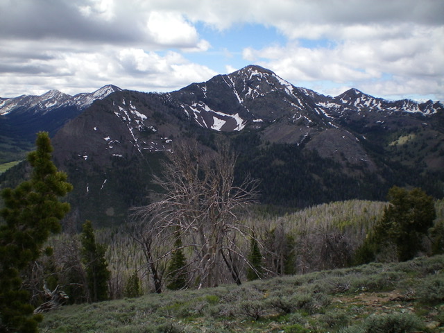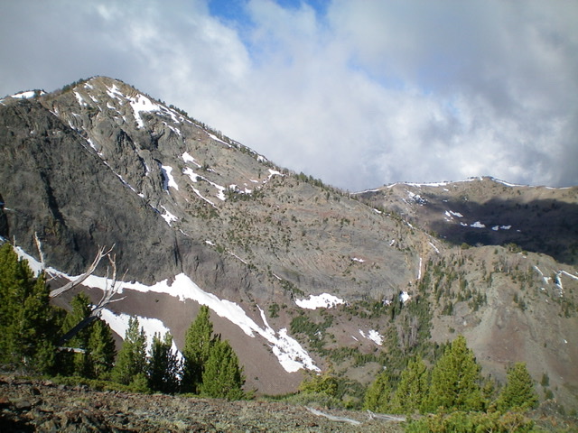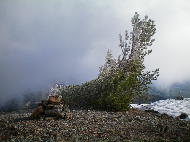 Climb the shoulder south then southwest to tree line then scramble west-southwest up a section of rocky terrain to reach the north ridge. Stay close to the ridge crest and skirt numerous patches of hard snow to advance up the rocky, narrow ridge. Higher up, move right/west across a short patch of hard snow (I used an ice ax and kicked steps here) to reach snow-free terrain to the right/west of the ridge crest. Scramble up through loose scree to regain the ridge crest. Follow the ridge south in open, somewhat-steep, loose scree to reach the summit. There is a modest cairn on top. Cloud cover limited my views.