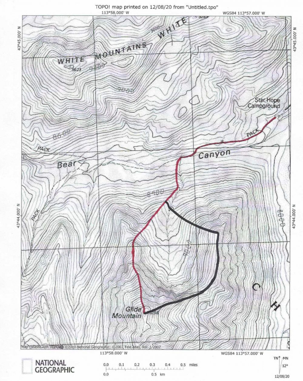 Breathe a sigh of relief once you reach the flat, forested ridge section. Follow the [still narrow] ridge northeast then north with some minor ups and downs to a critical juncture at 9,540 feet. There is a small, minor ridge point here (shown on the USGS topo map). Descend left/northwest from here down the northwest spur, which is a rounded, somewhat ill-defined shoulder, to get back to the critical stream drainage and the original ascent shoulder of the Northeast Spur/North Ridge ascent route. Follow that shoulder northeast then north to get back to the Bear Canyon Trail at the crossing of the small stream. Follow the Bear Canyon Trail back to the trailhead and the Star Hope Campground.