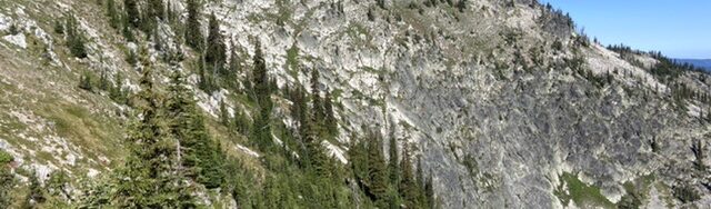The summit can be reached from any place along FSR-444. The southeast ridge begins at the sharp turn just before the road descends down to the Upper Gospel Lake Viewpoint. There is parking along the road. The route ascends through a mixture of meadow and forest to the summit ridge. Once the southeast ridge merges with the peak’s long summit ridge, trees and granite outcrops complicate the route. Of course, the high point is at the far end of the summit ridge.