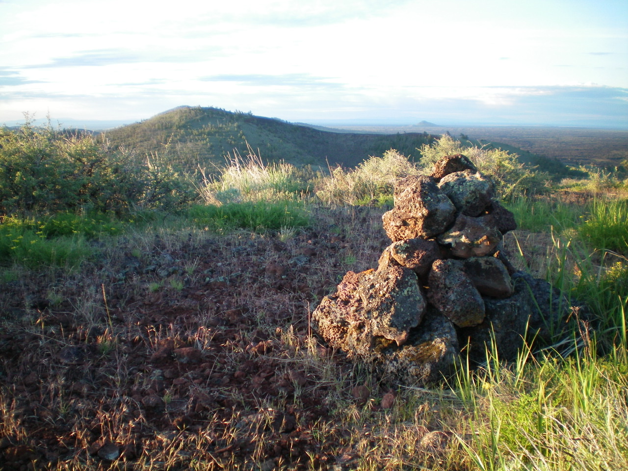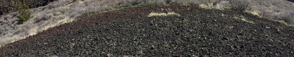 From the large parking pullout along US-20, cross to the north side of the highway and bash your way up a steep hillside of thick sagebrush and prickly bushes to the summit area (east summit). The east summit is a mix of scrub and open areas of lava gravel/talus. There was no summit cairn so I built one. The west summit is completely bare and is a hump of lava gravel. The USGS topo map contours make the west summit appear to be much higher than the [measured] east summit but it’s not. The traverse from the east summit to the west summit is not fun. The terrain is thick with sagebrush and prickly brush. I hope you decided to wear hiking PANTS today. You must drop 45 vertical feet to a minor saddle then climb 30 vertical feet to reach the west summit.