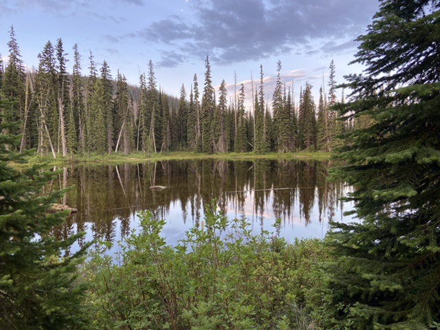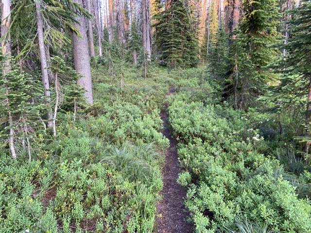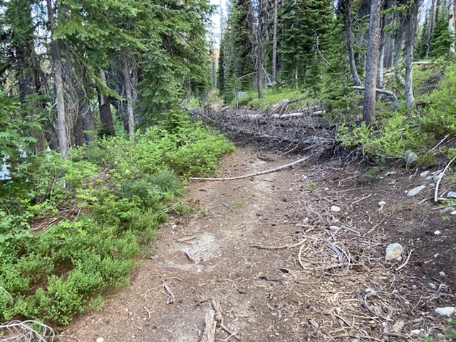 When you reach Lake 6121, look to your right for a sign marking the point where the road turns into the Friday Pass Trail/FST-045 (see photo below). This trail leads to Friday Pass in another 3.0 miles. Just below the pass, it meets the Grave Peak Lookout Trail described above. The route from the trailhead was interrupted by a lot of downfall in July 2021 and heather and other flora encroached on the tread in spots. This route is 10.0 miles with 2,857 feet of elevation gain round trip including a distressing climb on the way back between Lake 6121 and the trailhead.