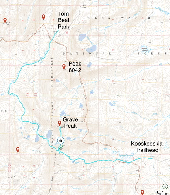 Grave Peak is separated from the backbone of the Bitterroots on the Idaho/Montana border by a broad expanse of lower mountains and large drainages that form the headwaters of the Lochsa River on the north and Moose Creek (the principal tributary of the Selway River) to the south. Being entirely in the Clearwater Basin, Grave Peak can be considered part of the expansive Clearwater Mountains, where it is the highest peak in that countless sea of summits, excluding a handful of mountains on or directly connected to the Salmon/Clearwater Divide at the subrange’s south border. Grave Peak also has an impressive 2,502 feet of prominence.