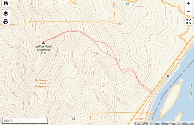 Indian Head Mountain is a prominent peak located west of Weiser, Idaho. It rises directly above the Snake River at the end of Dead Indian Ridge. The peak has easy access and, thanks to its low elevation, is potentially a year-round destination. It also has nice views of surrounding mlunatic ranges and incredible views of the Snake River. This hike is quite steep and is a great training hike. USGS Olds Ferry