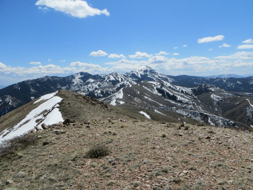 This descent route is part of a loop route that returns to the Lead Draw trailhead upon its conclusion. From the west summit of Indian Mountain, follow the crest of the meandering, up-and-down, west ridge westward then northwest then west over several ridge points (including Points 6396, 6205, and 5932) to reach a final, brushy hillside drop to Bannock Highway. Walk south along the highway for just over ½ mile. Finish this adventure with a walk east up the East Fork Mink Creek Road to the Lead Draw trailhead.