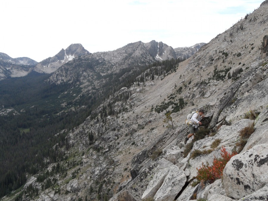 Based on John’s recon photo (see below), we identified the initial chute and started up it. At the top of the chute, we traversed to the right looking for a ramp (shown in the photo below). We then followed the obvious ramp to the right. The ramp was a wide, grass-covered stroll for as far as it went. However, it eventually ended. We then climbed up at this point, scrambling across steep Class 3 terrain until we reached another ramp which traversed left. When this ramp cliffed out, we bouldered up a short wall that gave entrance to the upper gully. We ascended the gully until it ended at a short wall.