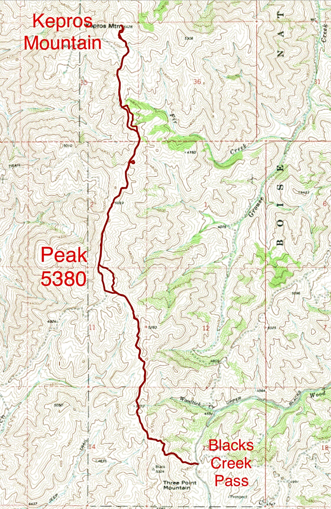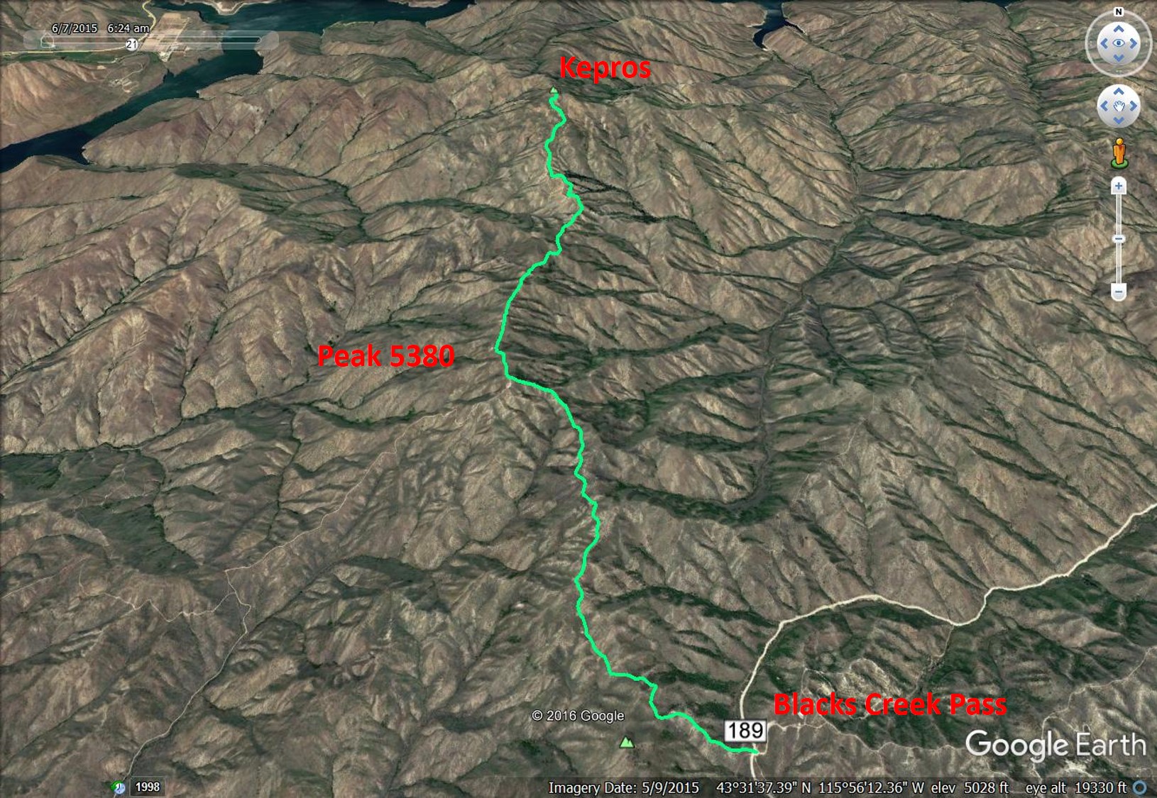 As a bonus, you can ascend Peak 5380 along the way without much of a detour. Like all Grand Slam Peaks, it’s a popular weekend ascent during the Spring. Kepros Mountain can be a long, hot ascent in Summer. In Fall, the peak and the area around it is heavily used by hunters and should be avoided. Kepros Mountain is also is doable in winter, with appropriate gear and Winter climbing skills. USGS Arrowrock Dam