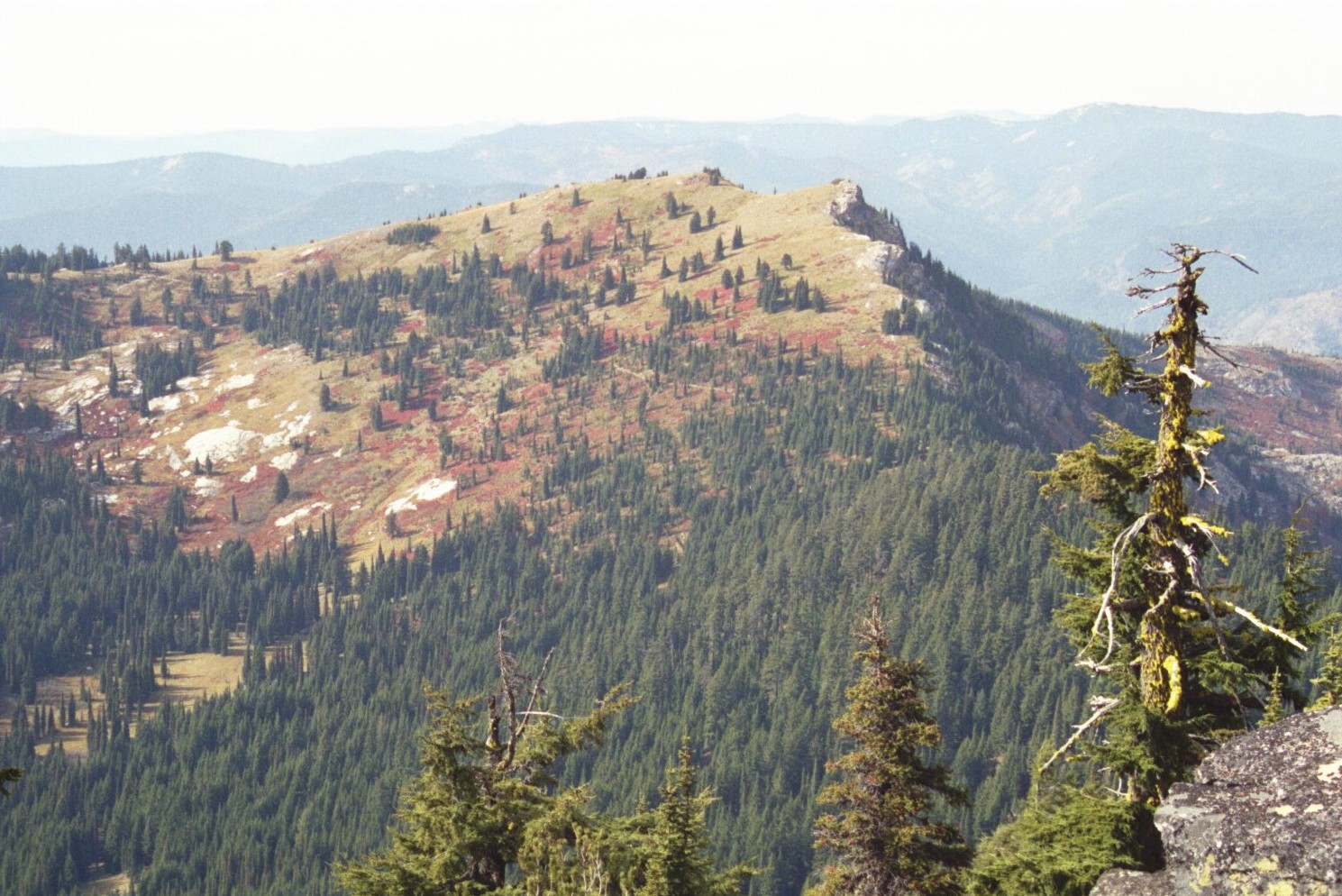Larkins Peak is the most easily accessible Mallard Larkins summit. However, its summit is generally ignored by hikers seeking the many lakes found on the north side of the divide. The peak’s north side, formed of broken cliffs and slopes, provides a dramatic 1,100-foot backdrop to Larkins Lake. The summit is open with a mosaic of mountain hemlock and subalpine fir with grasses, bear grass, whortle berry, heather and other vegetation found just below tree line. USGS Mallard Peak