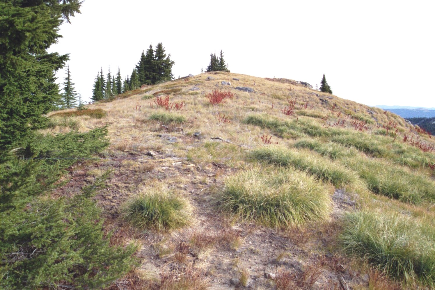 On maps, the FST-240 trail follows the ridge line more or less the entire way. The trail was rerouted in recent years,. It is now a more continuous and gentle grade mostly on the north side of the ridge for the first 2 miles and on the west side in the vicinity the Goat Ridge high point. The trail is well-maintained and the trailhead is obvious. A hike to the summit is a simple detour off the main trail to the south summit ridge. Debris on the summit indicates the presence of a historic lookout or perhaps an observation station of some sort.
