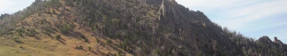 From the parking area, walk back to the main road (FSR-207) and hike west up the road to a three-way junction at 7,680 feet. You are now at the base of the Northeast Ridge of Mackay Peak. Climb west up the steep, open slope. As you approach the forest, turn left/southwest and climb through the open forest without too much difficulty. As you move higher, the terrain gets somewhat steeper and the forest thicker. You will find yourself in a mix of thick pine bushes, krummholz, and blowdown. At a few points, you’ll break out into the open, only to be hit with a short section of steep, large boulders. This is NOT a fun bushwhack.