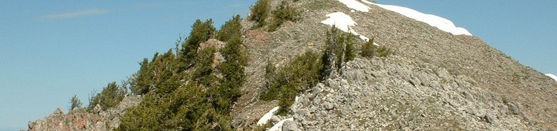 From the summit, descend southeast along the ridge on a moderately steep scrub-and-scree/talus mix. To keep the south ridge at a Class 2 difficulty, you must stay on the left/northeast side of the ridge crest. The entire east side of Meade Peak is a gentle slope of desert scrub; not a tree in sight. Follow the ridge crest (which is indicated by the Caribou County/Bear Lake County border on the USGS topo map) southeast to reach a flat meadow at about 9,450 feet. By doing so, you will stay away from the nasty, rocky aretes and rocky outcrops that are located just west of the ridge crest. I saw two nice mule deer bucks in this meadow as I descended the south ridge.