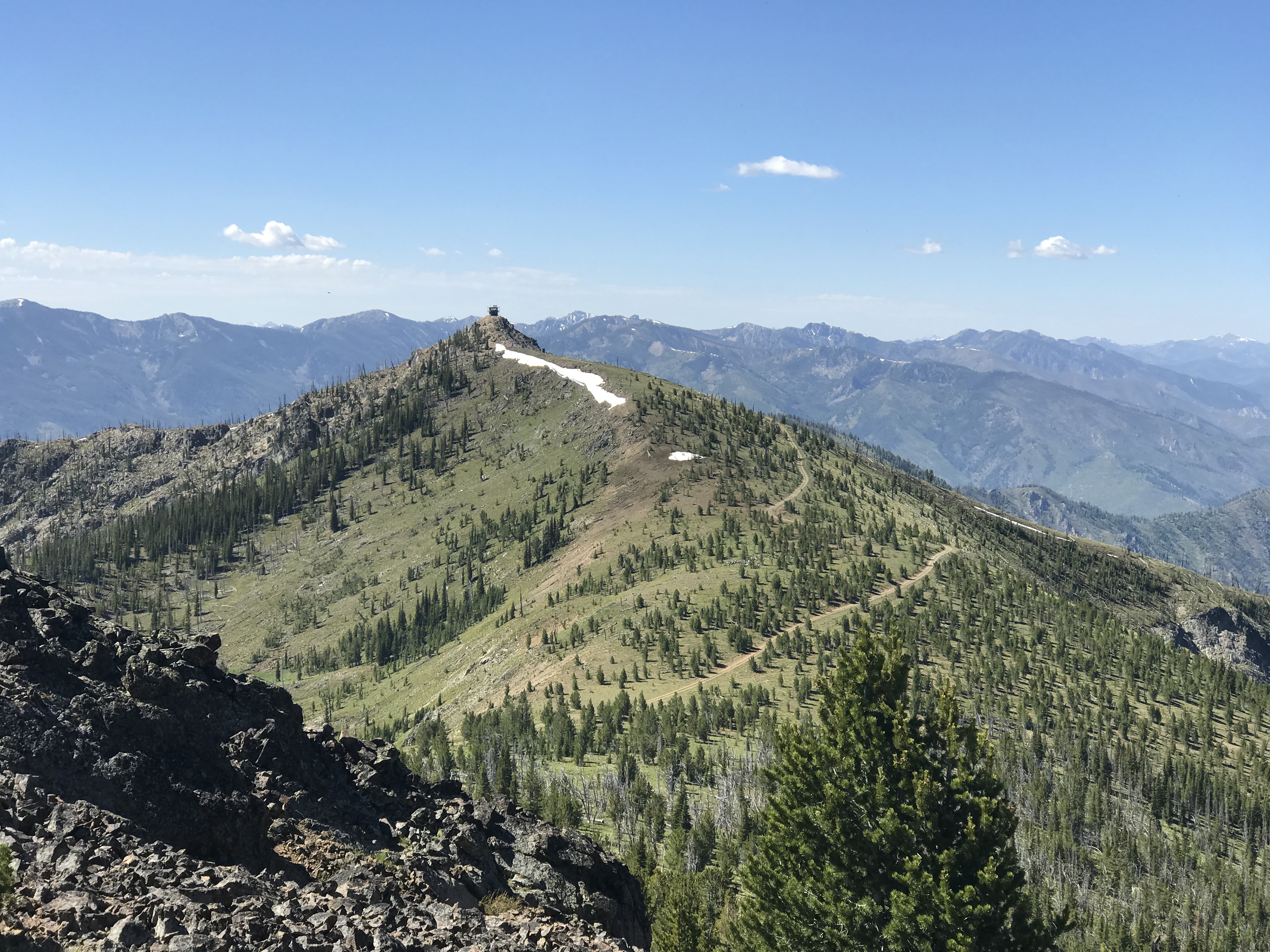 Middle Fork Peak is the only remaining lookout of the many which used to guard the Middle Fork Area. Its viewing range is large and impressive–one of the greatest in the Forest. Middle Fork Peak is regularly manned and has a newer building in place of the early 1920s structure, and it is in as good a shape as any lookout.