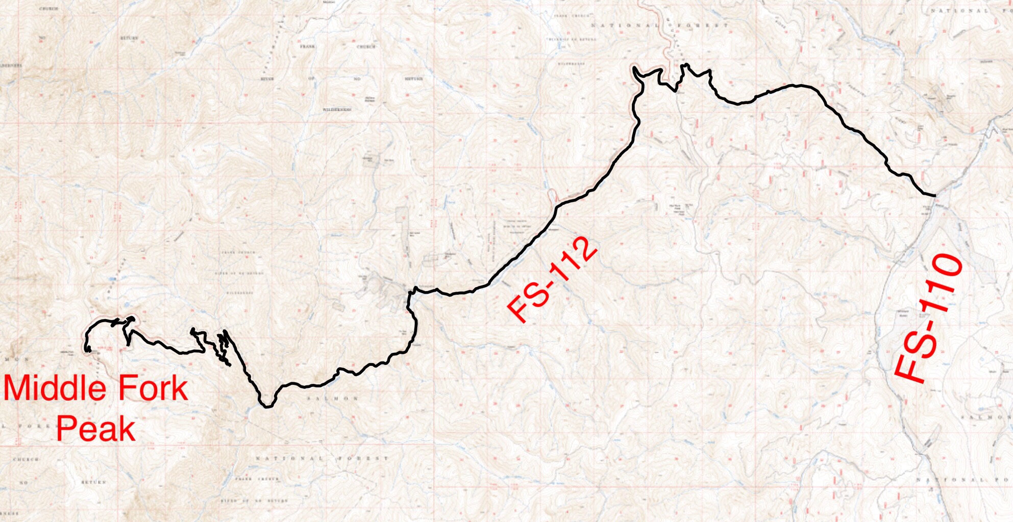 Middle Fork Peak is the second-highest point in the Yellowjacket Mountains Subrange of the Salmon River Mountains. This peak is an impressive island in the sky, but is remote and difficult to reach by any measure. As I note in the book, the peak is reached by both road and trail. The road is long, bumpy and requires self-sufficiency. It would constitute a mondo mountain bike climb. The road approach is long and rough. It will take you hours to reach this remote mountain. The trail approach from the Middle Fork Salmon River requires 5,000 feet of elevation gain and that is before you make the long trek into the Middle Fork. The peak’s history as a fire lookout is recounted down the page. USGS Aparejo Point