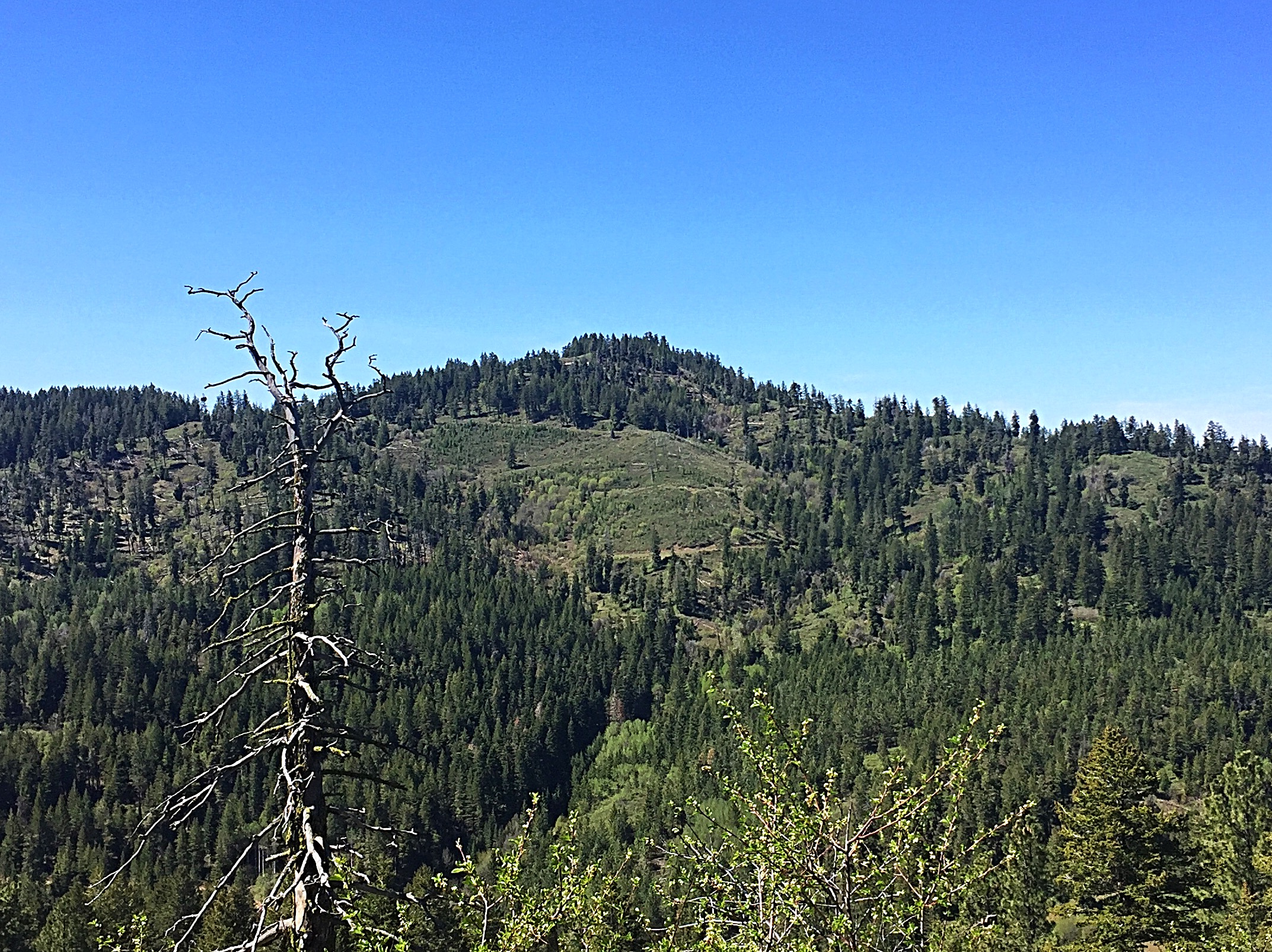 From the end of the road, look for an old road running southeast. Follow this road until it dies out. A rough trail continues southeast and then turns into the saddle between the summit and Point 5812. You will find an old logging road in this saddle. Follow it across the saddle through a brushy spot and then turn right. The summit is directly above you. Climb up the grass-covered slope to the top where you will find the ruins of a small CMU building and a summit register left by Jon Fredland.