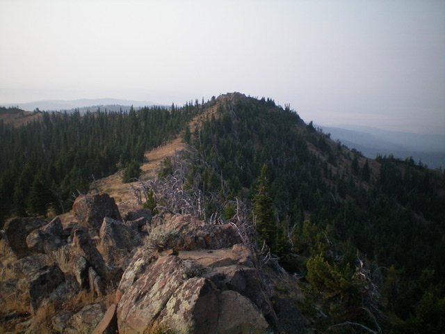 Leave the road and bushwhack east up through a somewhat thick pine forest to reach open grass/scrub pretty quickly. Angle right-ish/southeast to remain in open terrain and stay to the right/south of the pine forest higher up. The west ridge now has definition and is easy to follow. As the USGS topo map shows, the ridge crest and its south side are in open terrain as compared to the forested north side of the ridge crest. The ridge crest has a few minor rocky outcrops but nothing to be concerned about.