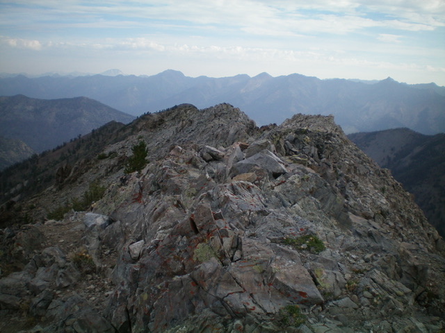 Oh, but thanks to a climber’s trail, it will be easy. And pretty fast. Follow the climber’s trail on or along the left/west side of the choppy, rocky south ridge all the way to the summit. The trail has a few minor ups and downs and has some loose scree/gravel in spots but, overall, it’s quite good. The summit is a ridgeline summit. It has a small cairn, two USGS benchmarks, and some triangulation wreckage. There are a bunch of summit registers in a plastic toolbox nearby.