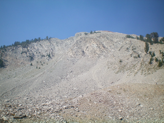 From the summit, descend the steep, loose talus/scree on the east face just north of the summit, where it is manageable. This initial portion of the descent is very steep and loose. Proceed down it slowly and use great care to not lose your footing. Partway down, move right/south onto a forested rib that has steep, but more stable, rock to downclimb (Class 2+). When the rib peters out, descend a steep-ish shoulder right/south to reach flatter terrain on a bench that is situated above a small tarn. From the bench, descend a steep, rocky gully to reach the tarn then follow its [dry] outlet drainage down a steep-ish, forested area to reach flatter terrain below.