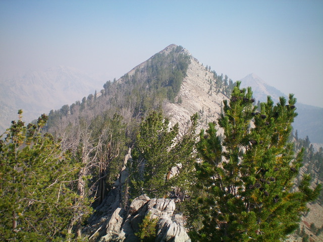From the 9,580-foot connecting saddle with Peak 9997, scramble northeast up a ridge with pines on the ridge crest and loose scree on its sides. Climb up over Point 9889. Point 9889 is a rocky ridge point with ridge pines nearby. From Point 9889, descend north on the right/east side of the pine-clogged crest to a minor saddle. From the saddle, scramble up the right/east side of the ridge crest to reach the open, narrow, rocky summit of Peak 10027. The final push to the top is mostly on the ridge crest. The summit has a modest cairn with a tree branch stuck in it.