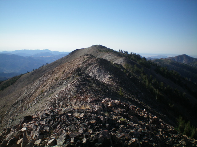 From the 9,820-foot connecting saddle with Baker Peak, scramble east on either the narrow, choppy outcrops/talus of the ridge proper or up an easy, broken-rock slope then a talus slope to Point 10120+ (a rocky, narrow ridgeline point). I did the latter on the ascent and the former on the descent. From Point 10120+ (which measures only 10 feet lower than the true summit), scramble along a rocky, up-and-down, narrow ridge crest to reach a final saddle. From the saddle, head up over two more talus humps to reach the talus pile that is the summit of Peak 10137. The summit has a nice cairn with a stick in it.