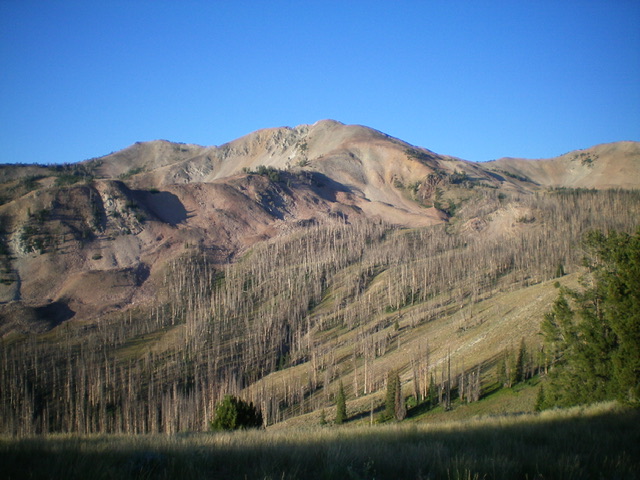 From the summit, return to the 9,820-foot connecting saddle with Baker Peak. Rather than re-climb Baker Peak and descend its northeast ridge, descend directly north off the saddle on a use trail that switchbacks its way down through loose scree/gravel into Slide Rock Canyon. The helpful trail soon disappears but the terrain in Slide Rock Canyon is not difficult. Angle diagonally downward and left/north to reach the north side of the basin/canyon. Stay just left/north of the half-burnt pine forest in the basin. The terrain here is mostly short scrub or dirt/pine duff.
