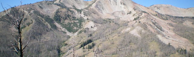 Keep heading down the basin/canyon until reaching the 8,800-foot level. At that point, begin a diagonal left/northeast traverse to reach the critical ridgeline west of Point 8905. The terrain is easiest from 8,800 feet to 8,700 feet. The terrain then becomes thicker scrub and is at a steeper angle to contour over onto the ridge. Once on the ridge, descend diagonally right/northeast down through the burnt forest to reach Baker Creek, aiming for the [visible] trailhead parking lot. Cross Baker Creek on a log and contour left/north to reach the Baker Lake Trail just above the parking lot. Follow the trail for a short distance down to the parking area and your vehicle.
