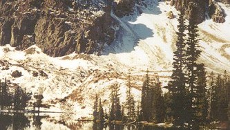 Surprisingly, before the second edition was published, no one reported climbing this picturesque peak. Iron Fish Peak is located just west of Iron Bog Lake. The peak is best climbed from the east. From the lake, follow FST-065 [(D)(1)(a) on Pages 260-261] west from Iron Bog Lake to the top of the divide. Leave the trail and climb toward the summit, staying on the easier ground on the West Side of the ridge. The ridge ends just below the summit block. Climb the summit block on its North Side via a short 50-foot gully. Class 3. USGS Smiley Mountain