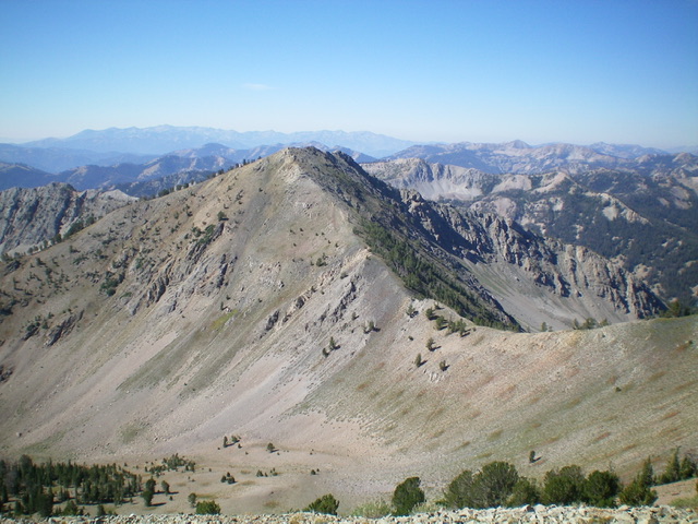 Hike 3.3 miles up FST-198/Mule Creek Trail to an unsigned trail junction (broken pieces of a trail sign are laying on the ground). Go left here onto FST-072/Big Smoky Trail and follow it for 0.4 miles as it drops into a meadow and heads southeast to a forested saddle at 8,300 feet. Leave the trail at the saddle and bushwhack northeast then east up through a thick pine forest with lots of large blowdown. The west ridge is not obvious and it is a convoluted mess in this area. Stay in open scrub/gravel as much as possible. This section is very steep and loose. Stay left/north of an impossibly steep, loose area.