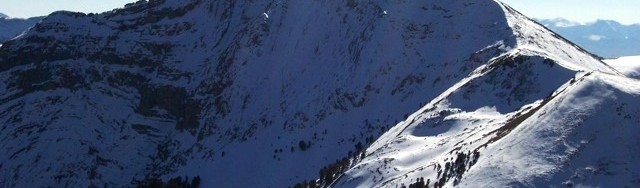 Climb south then southeast on the rocky ridge crest to reach the summit. The best footing is on the ridge crest. An on-and-off goat trail will help you make upward progress. The slope eases for the final section of ridge (the “summit ridge”) and, contrary to what it looks like from below, it is a steady uphill to the summit high point. It is not a choppy, tedious endeavor. The summit of Dianes Peak has an ID/MT boundary post in a cairn. The summit is on a narrow ridge crest and offers a magnificent view of the Nicholia Creek drainage. The ridgeline heading southeast from the summit is a wicked mess of crumbly towers, loose rock, and exposure and has probably never been climbed.