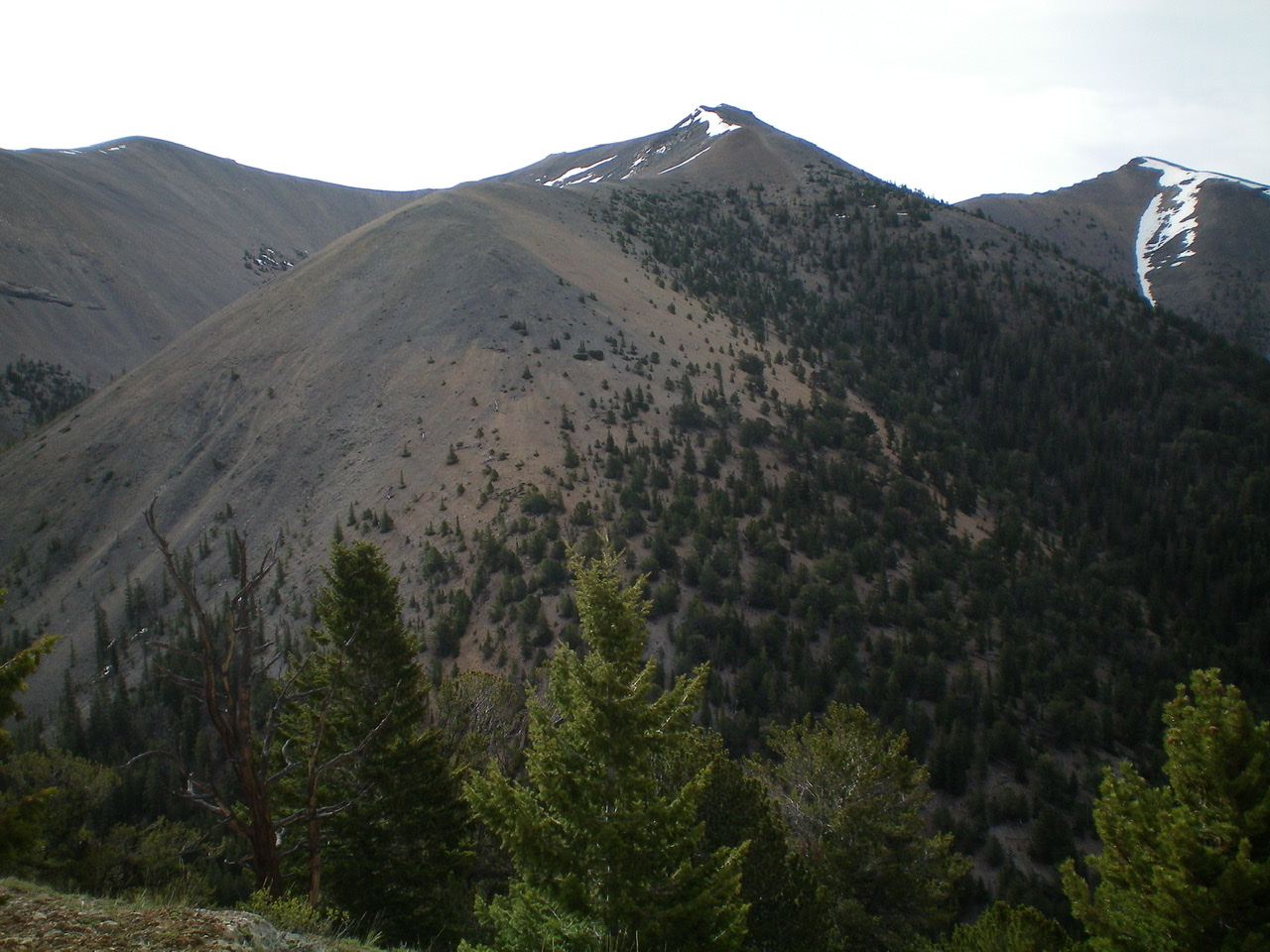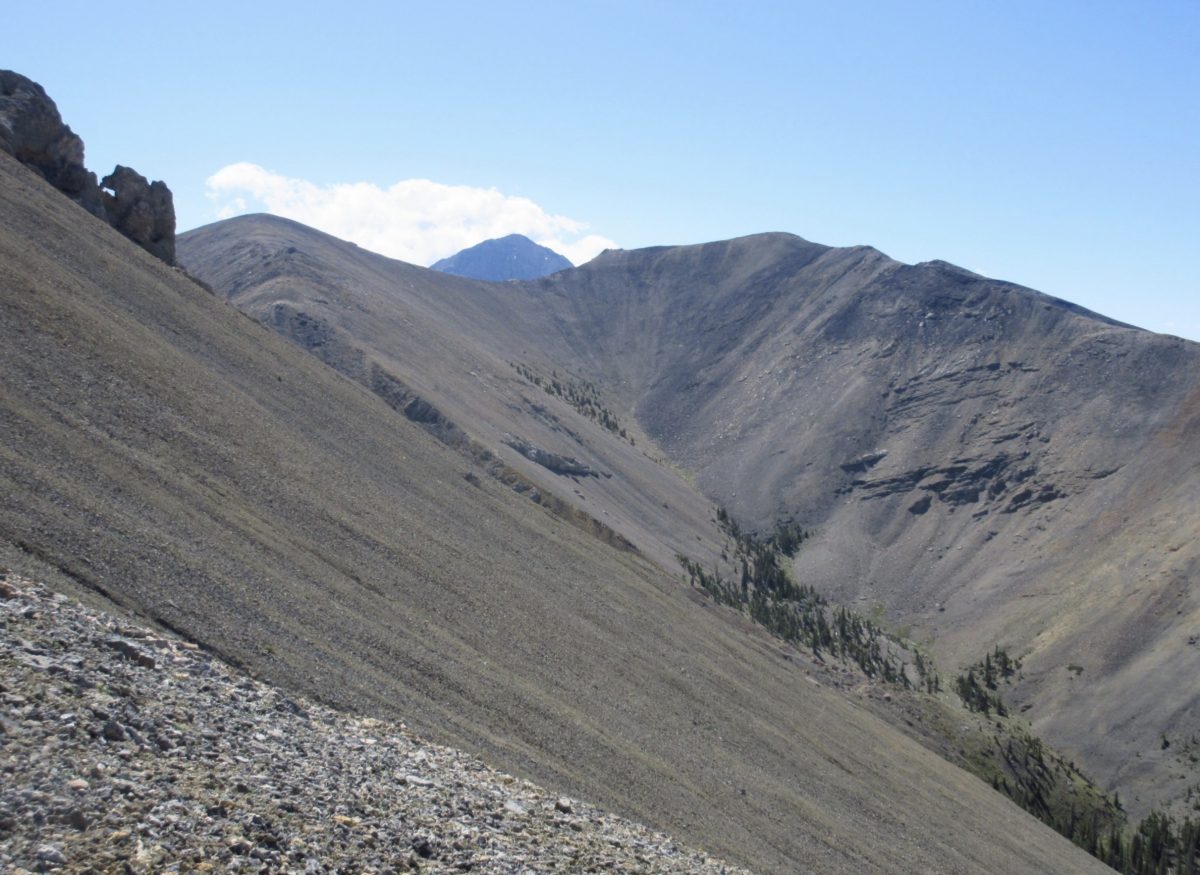 From the summit of Midway Mountain, cruise down the broken scree and easy rock of the northwest ridge to 9,800 feet. At this point, the ridge becomes rounded and ill-defined. To avoid the steepest terrain and to minimize the forest bushwhack, descend north on scree/gravel (boot-ski if you wish) to reach the forest below. Once you reach the pine forest, the pace slows down considerably. The pine forest has lots of blowdown to navigate around/through. You will soon reach the creek drainage of Cedar Run Canyon.